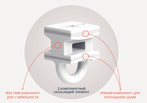 Первоклассные 2C бегунки и ролики (патент заявлен) в сочетании с карнизами со специальным покрытием позволяют портьере двигаться плавно и бесшумно. При производстве этих бегунков используются два материала: твердый компонент, обеспечивающий стабильность, и мягкий "наполнитель", поглощающий шум. Конечный результат - беспрецедентная тишина.